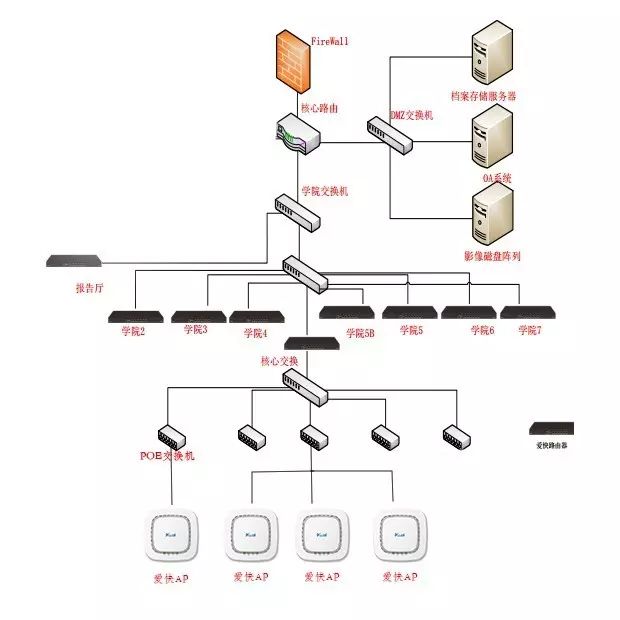 獲得了項目的基礎(chǔ)數(shù)據(jù)之后,就開始制定更加詳細(xì)的施工方案了,這里把學(xué)校無線網(wǎng)絡(luò)的拓?fù)鋱D給大家貼出來,從核心機(jī)房到各個教學(xué)樓全部光纜,從地下管道鋪過去,教學(xué)樓內(nèi)各個樓層也都利用全光交換機(jī)進(jìn)行光通信傳輸數(shù)據(jù),實現(xiàn)了主干網(wǎng)絡(luò)全光通信,能夠保證網(wǎng)絡(luò)質(zhì)量的穩(wěn)定。愛快的G60路由器帶有2個萬兆光口,配合萬兆光模塊,完美支持大型網(wǎng)絡(luò)的組網(wǎng),目前主干網(wǎng)絡(luò)容量為千兆,后期隨著網(wǎng)絡(luò)用戶的增加,可在此基礎(chǔ)上直接無縫升級為萬兆光網(wǎng)。???